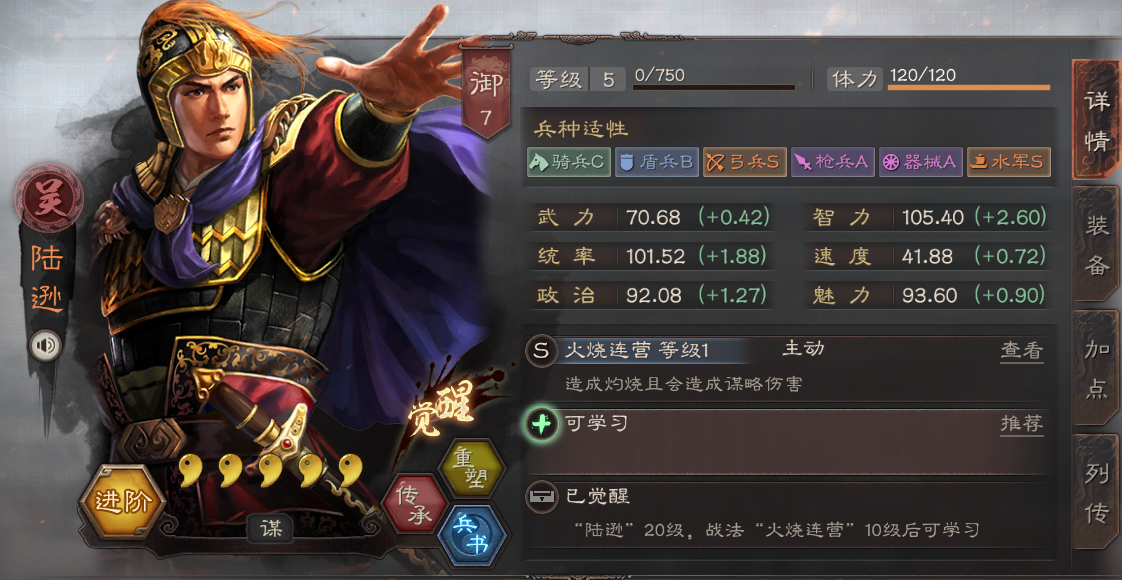 陆逊在吴国目前属于非常火热的武将,因为大部分的阵容都需要他,火热的吴枪.社稷弓.都督队.陆太鲁.肉弓等等,他的自带战法火烧连营的伤害非常高,同时还会施加灼烧状态,如果在灼烧的状态下则会触发焚营对敌军造成伤害,还有概率进入震慑状态,只能说这名武将是伤害控制集为一身的武将!