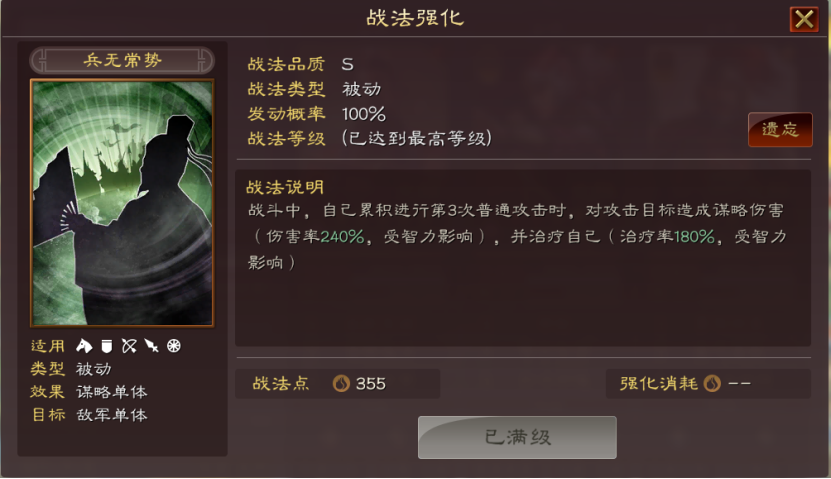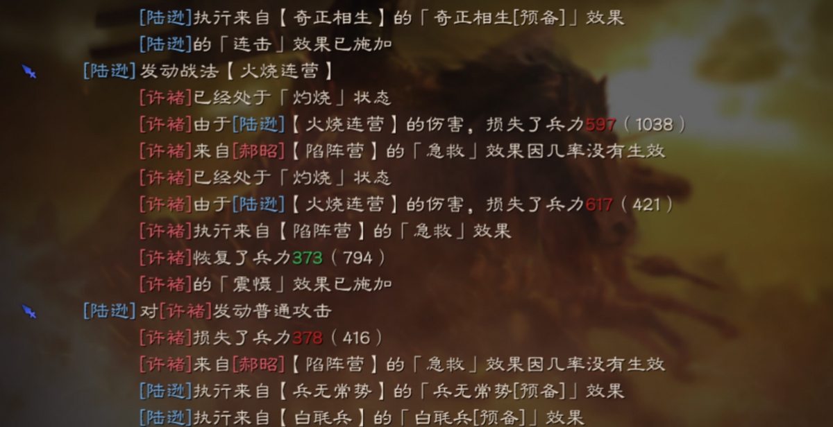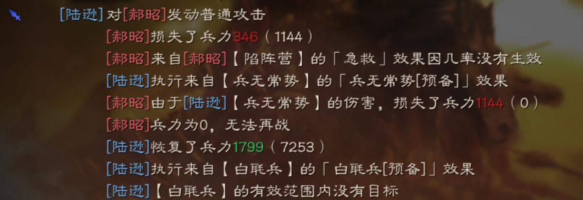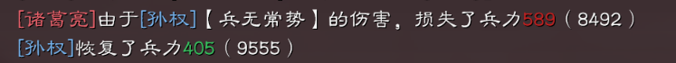 由于自身属性够优秀,并且有着奇正相生兵书的存在,陆逊可以很快的打出兵无常势的伤害以及回复。