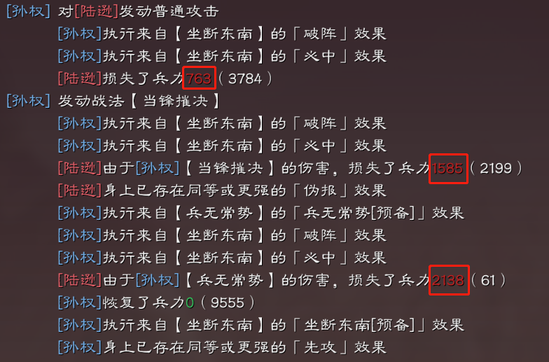 当然,如果仅仅是这样的话,也不会有那么多人去选择让孙权带兵无。最主要的是,兵无配合孙权自带战法的破阵与连击,经常会做到一个回合的爆发直接秒杀对面!