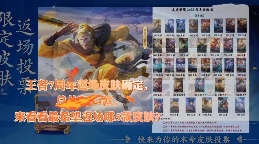 众所周知,王者荣耀每年暑假到国庆期间,都会有三个重要的节日,分别是夏日盛典、七夕还有周年庆。当然了,这三个节日当中,王者荣耀不仅会有新皮肤上架,同时还会有限定皮肤返场。虽然最近西游联动皮肤已经宣布结束,但是接下来还有三款文化主题皮肤上架。与此同时,七周年庆的限定皮肤返场名单已经公布,总共是会有34款参与投票哦。