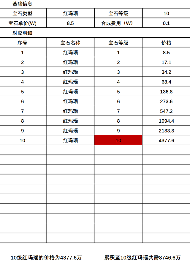 同时按照本区(鬼区)宝石收购价格,菜价将宝石折算成R,将已有装备上的宝石钱扣除,统计成如下表格。