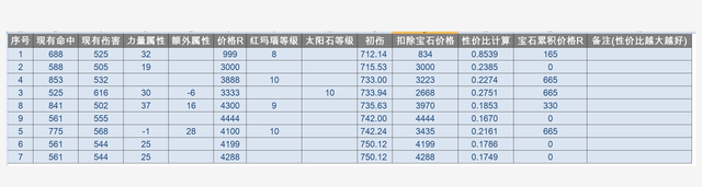 把所有数据摘录以后,用最终初伤/价格,会有一个性价比指数,最终去对比数据,比较的条件可以是同基础属性下,看看价格差;也可以每跨一定属性下,看看价格差(例如武器每多10点伤害,或者有无双加,或者是造型的价格差等等)最终根据自己的预算去选取适合自己的装备