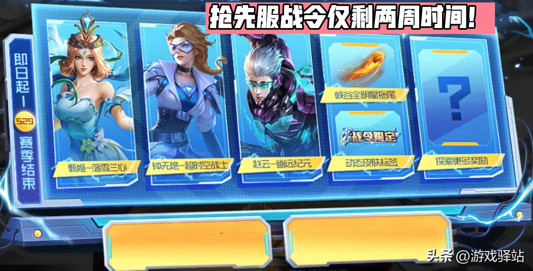 距离王者荣耀S30赛季开启仅剩不到一个月时间,其中抢先服的S29战令活动将在本月25号提前结束,也就是战令经验在两周后停止获取,并会先于正式服开启大版本测试。而正式服没有意外会在下月5号左右进行大版本更新,还未拿到钟无艳超时空战士和峡谷全明星拖尾特效的小伙伴记得做任务提升战令等级。