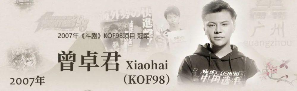 2007年“斗剧”KOF98项目上他勇夺冠军,中国格斗项目的巅峰荣誉。曾卓君“Xiaohai”一直是活跃在格斗舞台上的国手,在这些年间斩获了无数荣誉。这些年间,他多次前往美国、日本等格斗电竞大国征战,并屡次击败强敌夺冠。如今,曾卓君“Xiaohai”依然争战在国际格斗比赛的舞台上,并且保持着良好的状态。他是毫无疑问的“中国格斗电竞第一人”。格斗电竞爱好者尊称“导师”,曾卓君“Xiaohai”也同时为中国玩家推广格斗类的电竞项目做出巨大贡献。