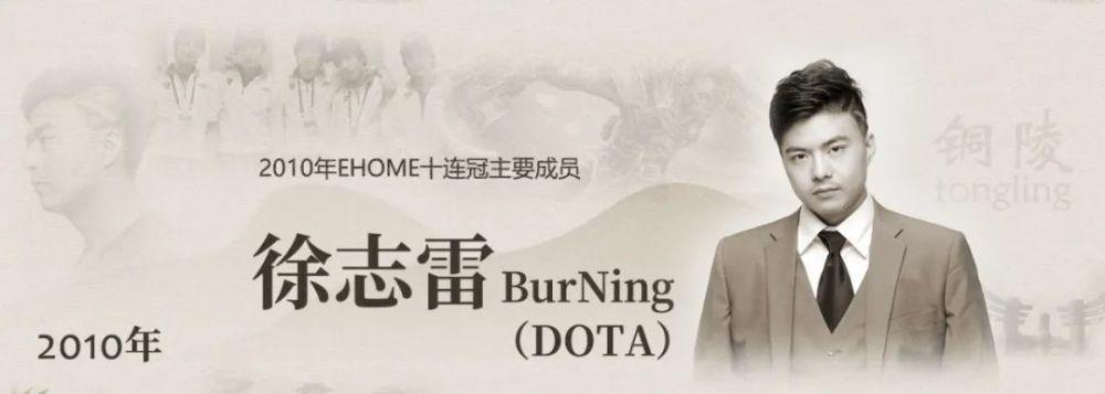 2010年EHOME十连冠主要成员,他在自己漫长的职业生涯中拿到了30多个冠军,创造了电竞的历史,也是电竞进入厂商时代之前最巅峰成绩的选手。徐志雷“BurNing”也是DOTA项目真正意义上的第一个明星选手,为这个项目的流行和推广做出了重大贡献。