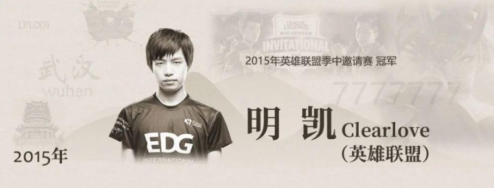 2015年英雄联盟季中邀请赛冠军。明凯“Clearlove”为中国英雄联盟夺得第一个世界冠军、第一个拳头官方国际赛事冠军,而创造个人纪录的5次联赛冠军也彰显了他在LPL赛区的超强统治力。退役之后,他不忘初心,转型教练,正在为新的荣耀继续拼搏。