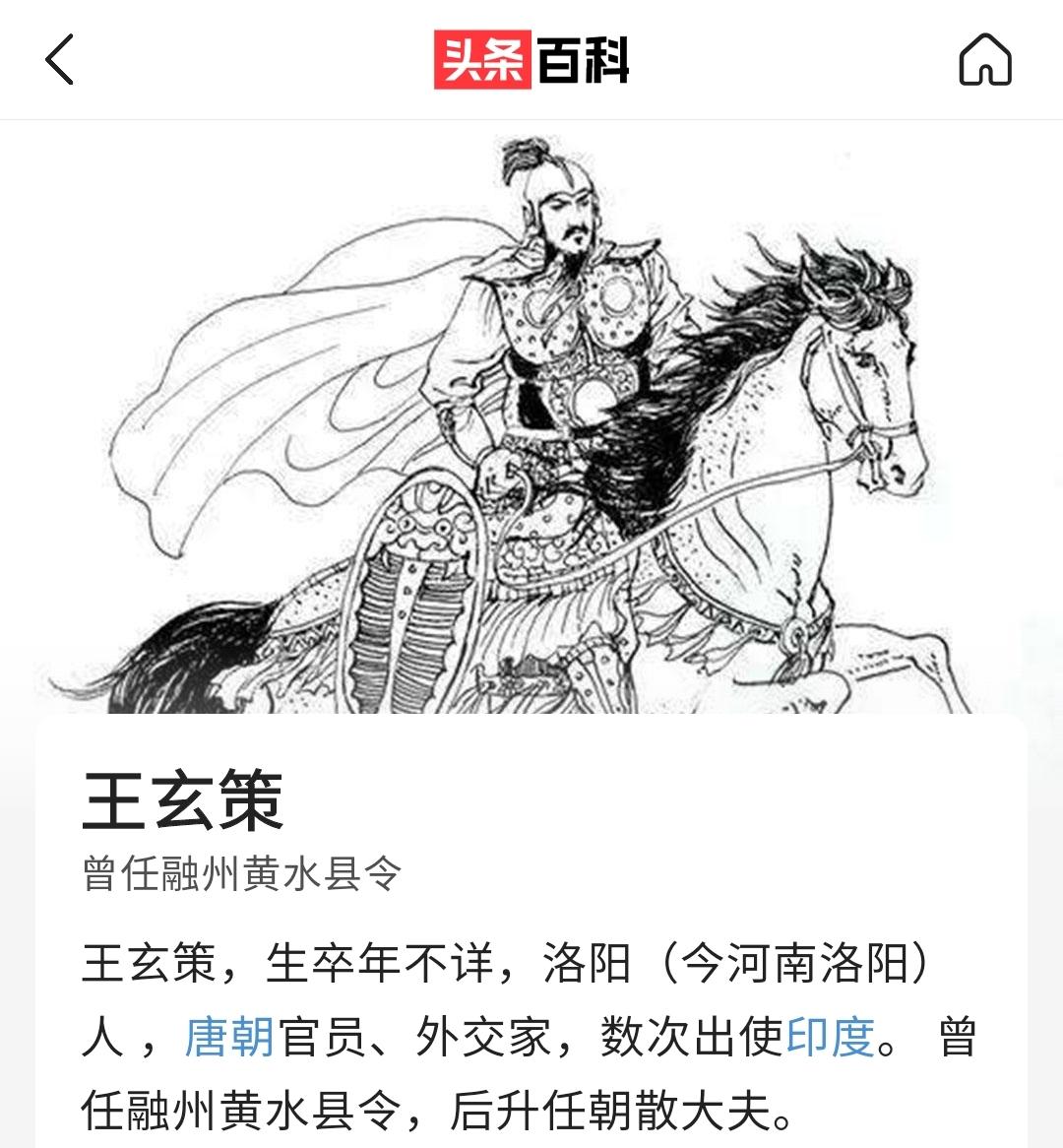 公元647年,王玄策为使出行(天竺)印度,天竺国王派自己的儿子随王玄策到唐朝进贡,谁知期间天竺内乱,国王暴毙,本应继位的国王之子却在唐境,王玄策带兵2000人,把天竺打的落花流水,杀敌数万,俘敌3万,牛羊无数,王玄策将俘虏送至长安,一时间名声大震。
