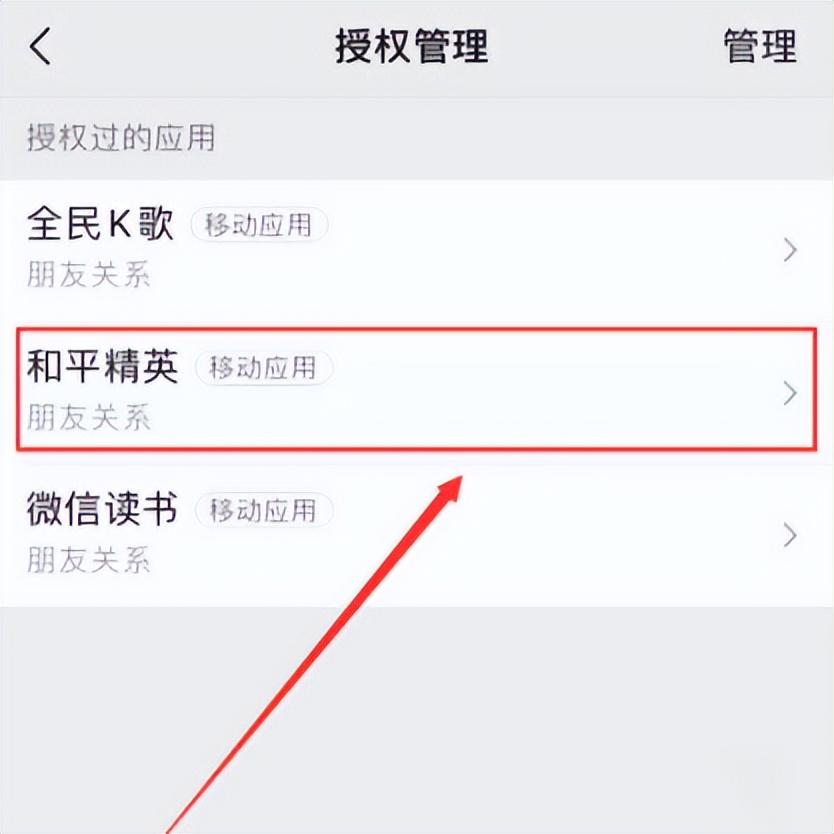 5. 在打开的授权列表中,找到和平精英选项,打开。