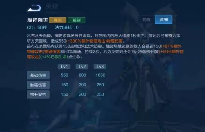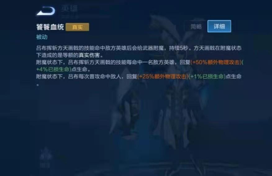 看了技能介绍后我们可以发现,吕布被动附魔的两种关键效果——真伤和回血。附魔后的吕布普攻后能造成额外且等额的真实伤害,相当于输出直接提高了一倍,这也是吕布能够打肉前排的资本。
