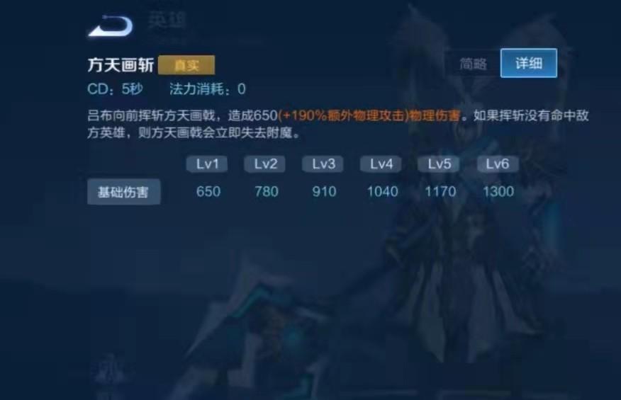 吕布挥斩方天画戟的技能,命中敌方后会给武器附魔,持续五秒,方天画戟在附魔状态下造成的是等额的真实伤害,并且还能回复自己的生命值,而命中英雄比小兵回复的更高。