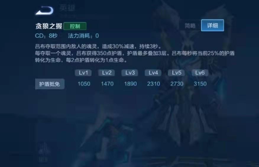 每夺取一个魂灵,吕布获得350点护盾,护盾最多叠加三层。吕布每秒将当前25%的护盾转化为生命,每两点护盾转化为一点生命。