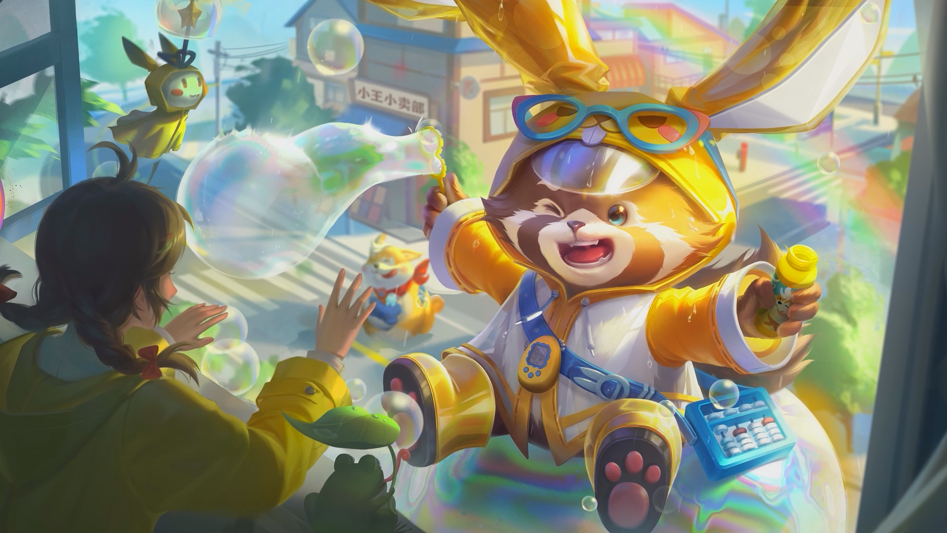 出场动画:梦奇抱着彩色大泡泡去找同伴玩耍。从皮肤名字和风格上来看,这跟阿古朵的顽趣属于同系列,但很奇怪的是居然变成了赛年皮肤。