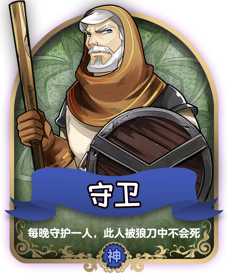 守卫牌是一张神职牌,但却是一张弱神牌。它不同于女巫手里有掌握生杀大权的双药,也不同于猎人死后能开枪自证身份。守卫是一张在夜里默默守护着大家,保护好人们与狼刀拼死对抗的神职牌。