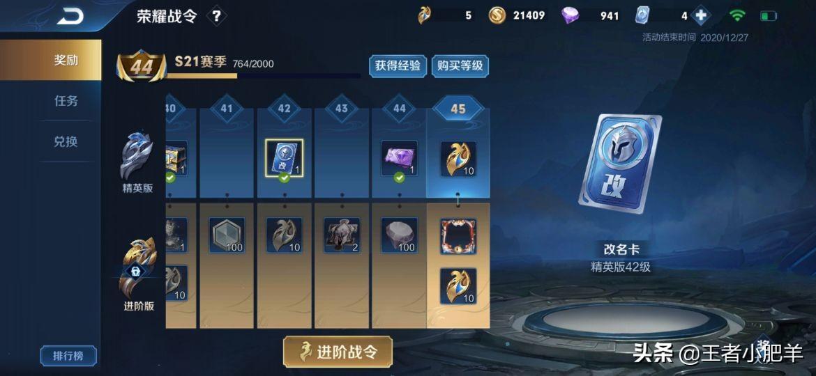 在王者荣耀中,有一个战令系统。不需要玩家任何消费,只用每周完成游戏任务,获得战令经验,快速升级自己的战令等级达到42级,就能获得一张改名卡。