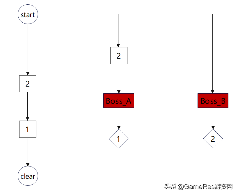 该图想表达的是一个简单的游戏流程,这种结构的图常见于银河恶魔城类型的游戏设计中,看图所表述的意思,要通过这个游戏,需要玩家通过两个锁,锁1和锁2,获得钥匙1,需要打败Boss_A,但是要见到Boss_A,首先需要打败Boss_B拿到钥匙2。两个Boss都打败后,可以通关这个游戏。