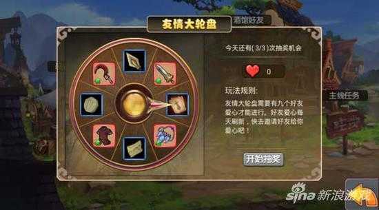 友情大转盘就是能够使用爱心来抽奖的玩法,主界面上方的转盘,就可以进行抽奖。每次抽奖需要消耗9个爱心,每天只有3次机会。抽奖能够获得4级装备碎片或合成材料等,所以还是非常不错的资源来源。