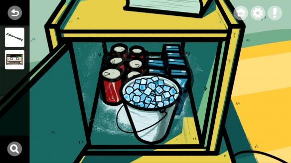 点击写着“调酒区”三个大字的小黑板,进入调酒区,按照顺序放入四种材料,成功调出莫吉托,找到第二块磁带,观察上方的图案,之后将磁带放入娱乐室的播放磁带的机器中。