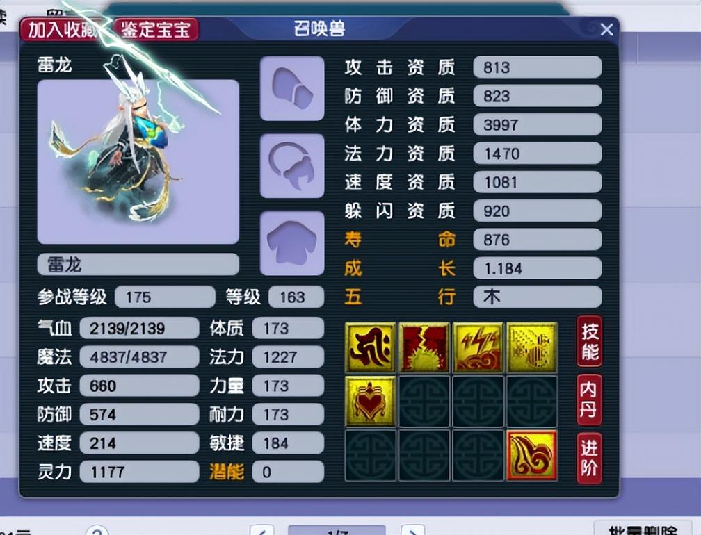这个雷龙现在真的是处于一个尴尬的局面。技能5个本身就很少了,因为现在法宠需要的技能已经明显变多了。在高级进击法术暴击和高级遗志加入之下,还有出其不意和出奇制胜这两个技能。