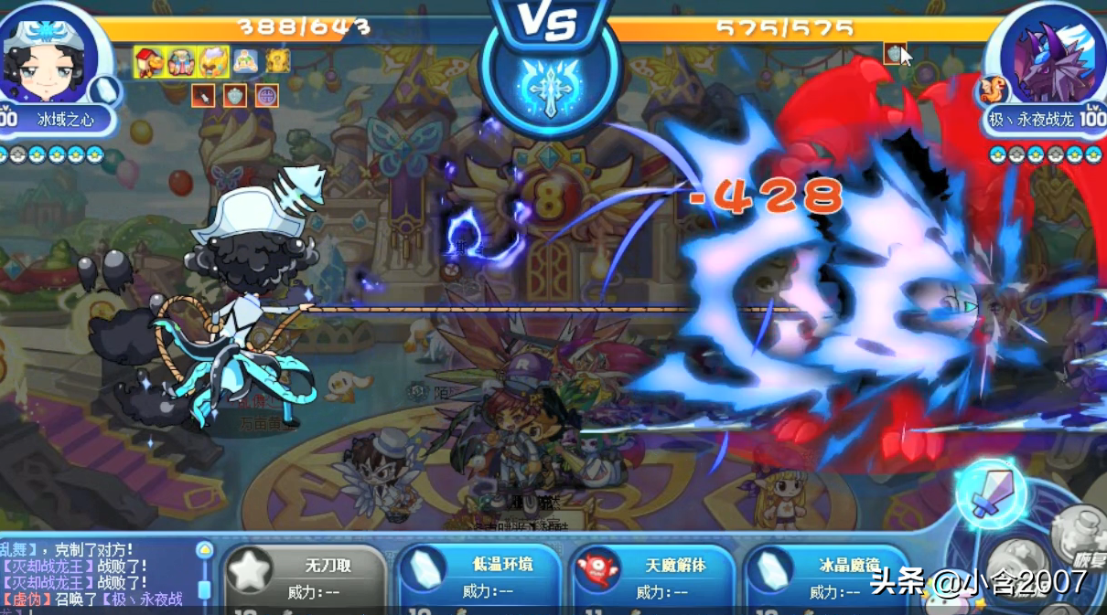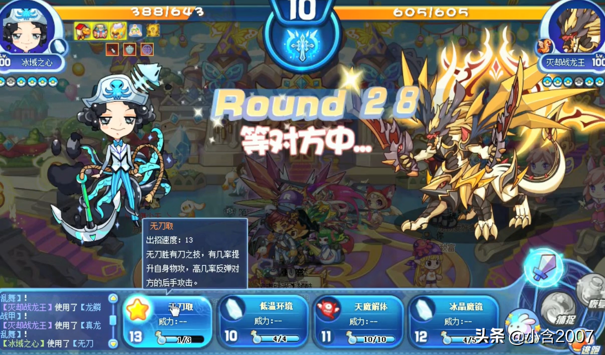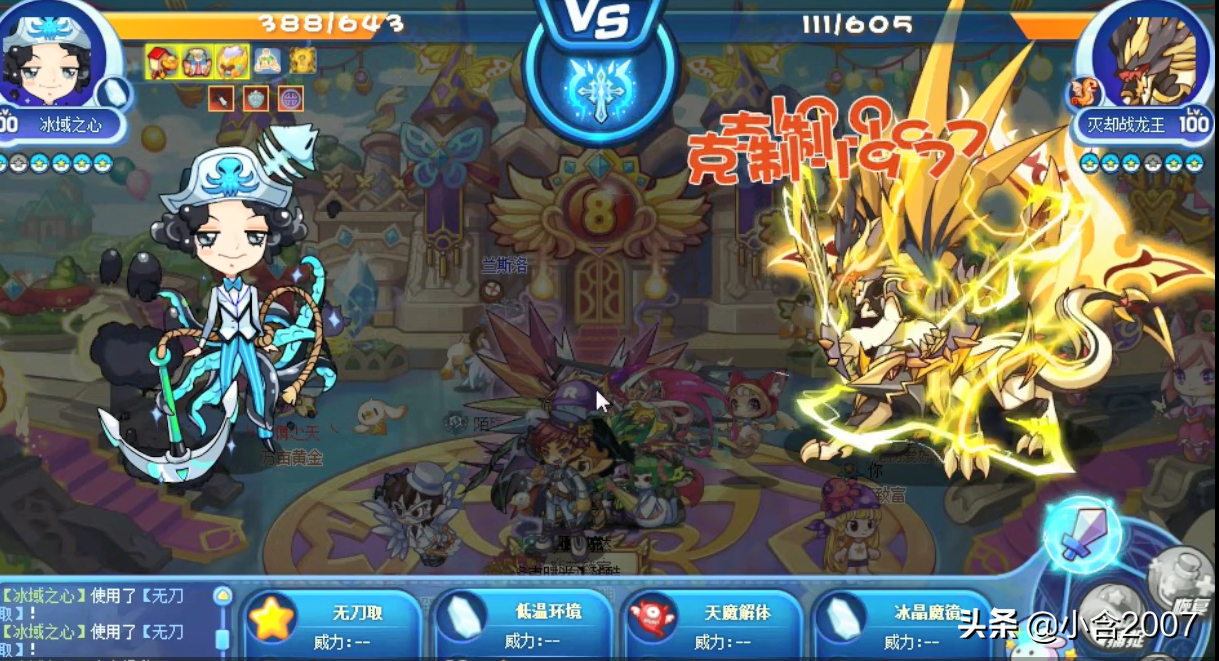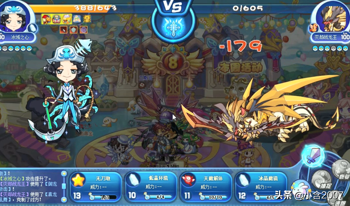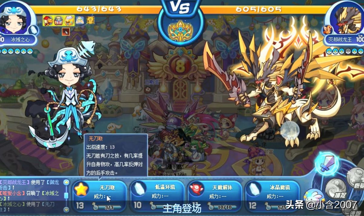冰域之心VS灭却战龙王,灭却战龙王是龙系精灵王,拥有先手+7的反伤技能和超高的输出能力。不过龙王也有一个致命弱点,就是开了反伤以后的龙王如果被反弹的话,那么龙王会受到双倍伤害,这就有点神奇了。