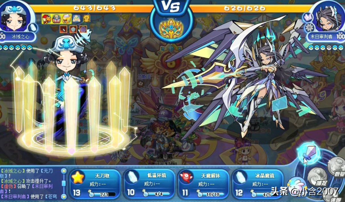 我方冰域之心的技能搭配为:无刀取、低温环境、天魔解体、冰晶魔镜。