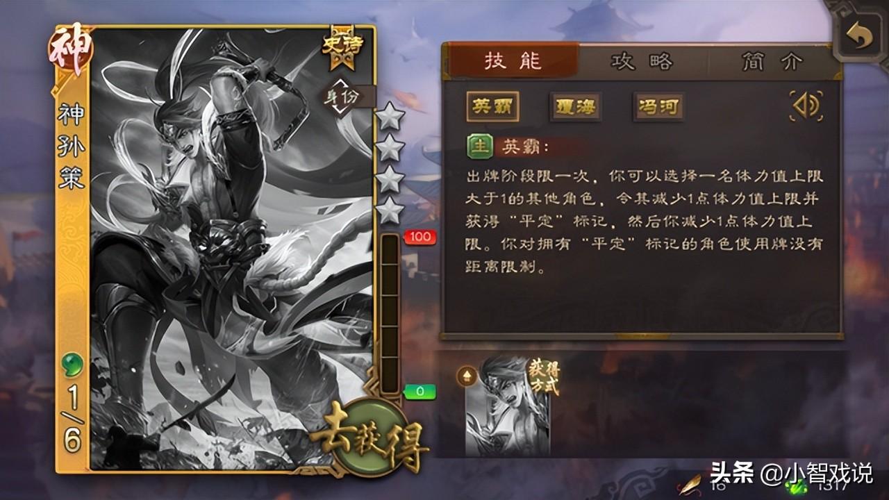 毕竟没用用过这个角色,大概分析一下技能。一技能英霸有些离谱,毕竟大部分武将回合外的手牌上限都要靠体力数量维持,也就是单打情况下,一个三血武将两回合后基本就废了。回合外只能留下一张牌够干啥的?而神孙策开局就是6上限1血,怎么和他比?