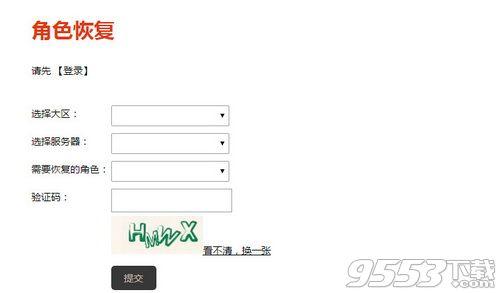 2.之后我们即可看到角色恢复的界面,我们选择好大区、服务器、要恢复的角色、验证码,点击"提交"即可,如图所示。