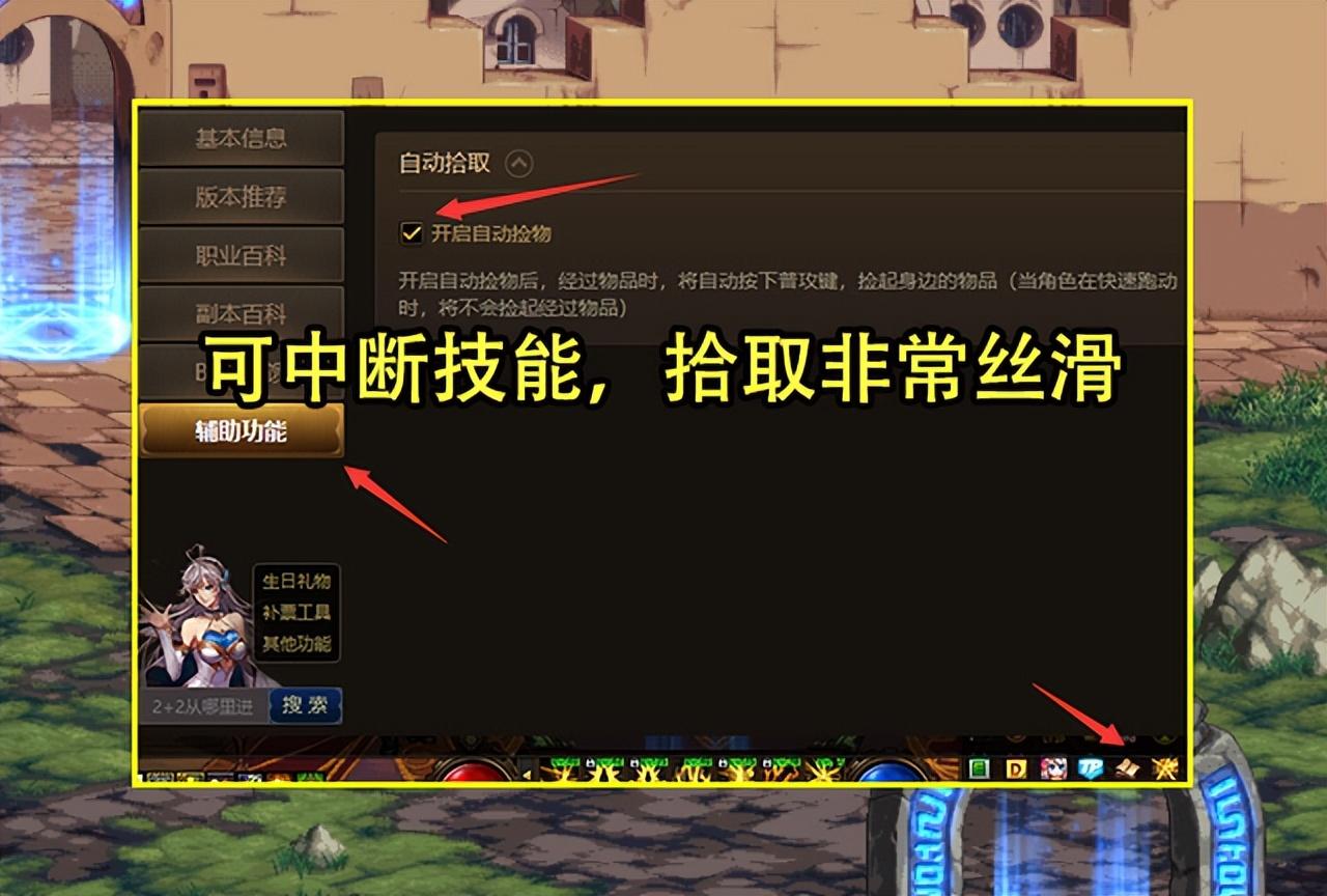 其次,拾取动作可以中断技能释放了!快捷拾取物品的方式总共有2种,一个是聊天快捷键设置的“移动物品”,二是在“辅助功能”设置的“开启自动捡物”,移动物品可一键聚物,开启自动捡物则到物品旁会自动捡起。但是让人意外的是,这次更新之后,只要用移动物品+开启自动捡物功能,就可以打断技能释放拾取物品,加快拾取物品的效率,而且捡东西非常丝滑,搬砖党一定要记得开。