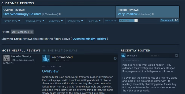 Steam拥有一个方便的评论系统,能够让玩家更容易了解其他玩家对游戏的看法。只要在Steam上的任何游戏页面上向下滚动就能看到。你可以根据积极或消极评价,评论者玩游戏的时间等标准进行筛选。甚至还可以看到一段时间内的评论图表。