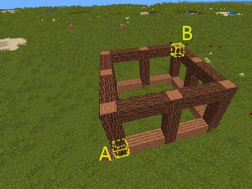 1、记下需要复制的建筑物对角线两端的坐标,如上图A点(坐标Xa Ya Za)和B点(坐标Xb Yb Zb),两个坐标之间的所有方块就是要复制的对象。