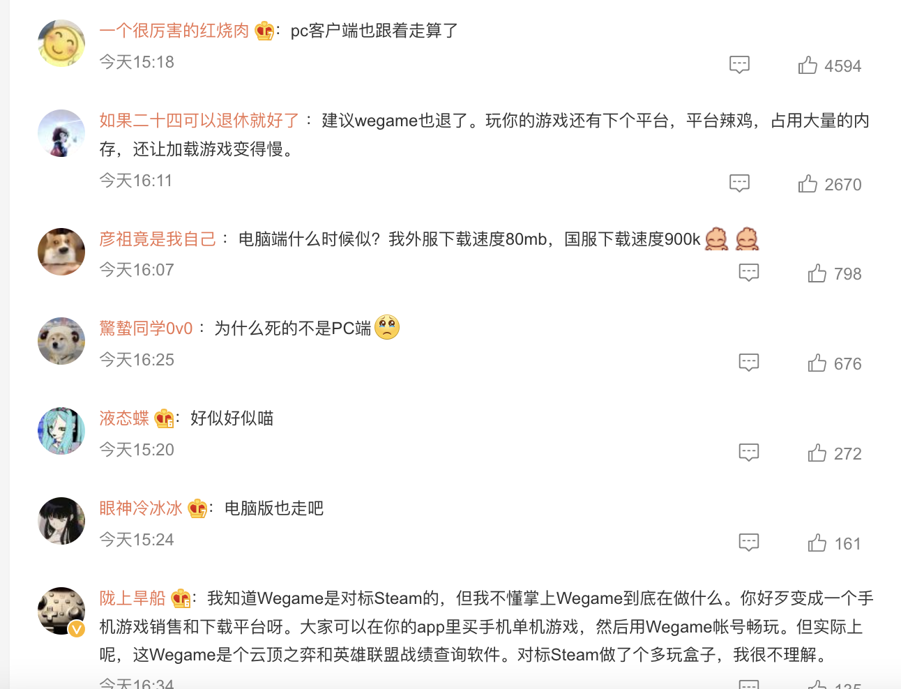 在社交平台上,大部分玩家对《掌上WeGame》的停运不以为然,热评纷纷支持 PC客户端WeGame也停运。