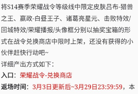 等了一年,终于迎来了S14赛季战令奖励的限时返场,包括吕布-猎兽之王、诸葛亮星元宝箱、龙御九霄宝箱、嬴政-白昼王子宝箱。将会在3月3日更新以后,上架荣耀战令的兑换商城。不过有个条件,就是本赛季必须要进阶战令。