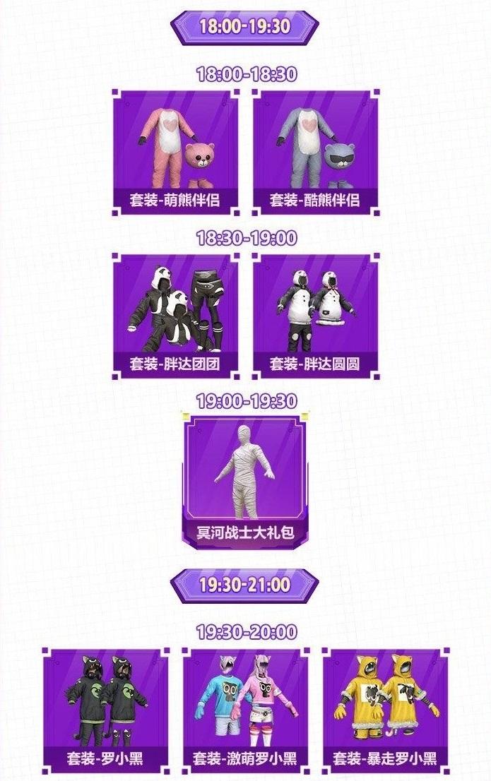 到了19点,就会返场冥河战士大礼包,这个礼包里面包含了军需的全部皮肤,应该是8000点券。19点30则会返场3款罗小黑系列套装,同样也是直售。