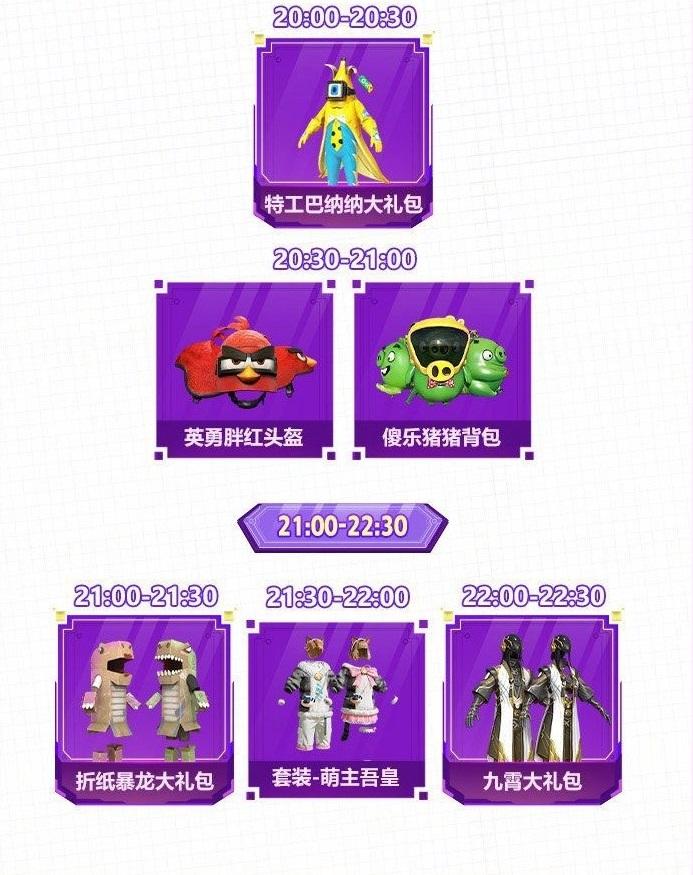 20点30返场愤怒的小鸟系列头盔和背包,也是挺良心的皮肤。21点往后就会返场折纸暴龙大礼包、九霄大礼包、萌主吾皇套装。个人觉得这回返场的皮肤,都算是挺精品的了。