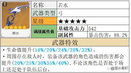 若水作为夜兰的专武,在数值设计上选择了五星里白值的最低档,相应的副属性有了高达88.2%的暴击伤害加成;被动为生命值提升和简单粗暴的伤害加成效果,将夜兰的输出能力最大化。不过武器带若水之后,圣遗物就需要承担所有的充能压力。
