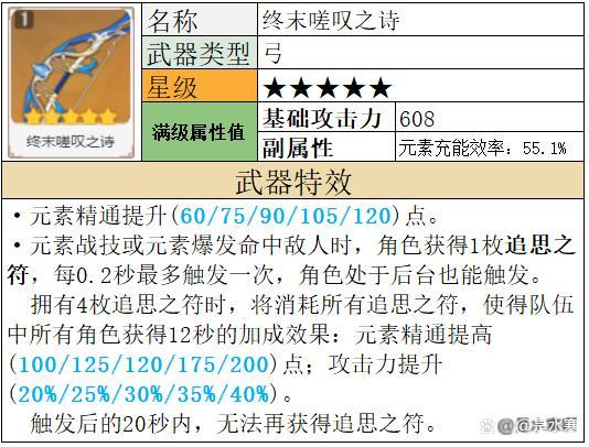 终末嗟叹之诗是辅助神器,同样和适合夜兰,是夜兰的最优选择之一。副属性55.1%的元素充能效率可以让夜兰的充能更好毕业;被动很好触发,精1就可以给全队带来100点元素精通,以及20%的攻击力加成。