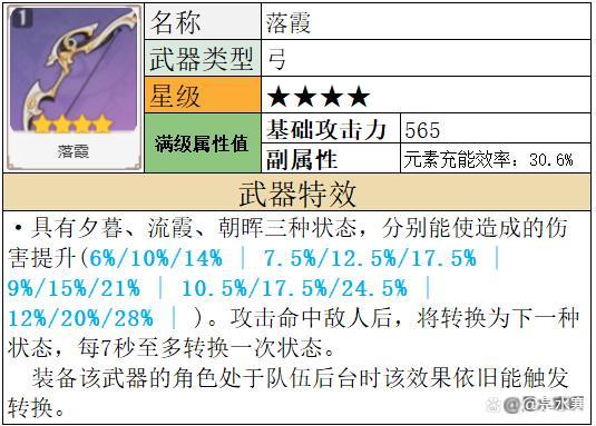 乍一看以为落霞是夜兰的四星专武,结果一看白值565,还是差了点意思。若落霞的基础攻击力设定和西风猎弓一样,那毫无疑问落霞在夜兰这能超过部分五星武器。