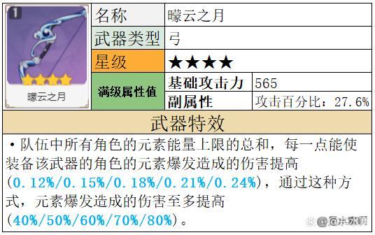 曚云之月同样可以带,不过副属性的攻击百分比对夜兰没有收益,因此武器只需精炼不必升级也可以。