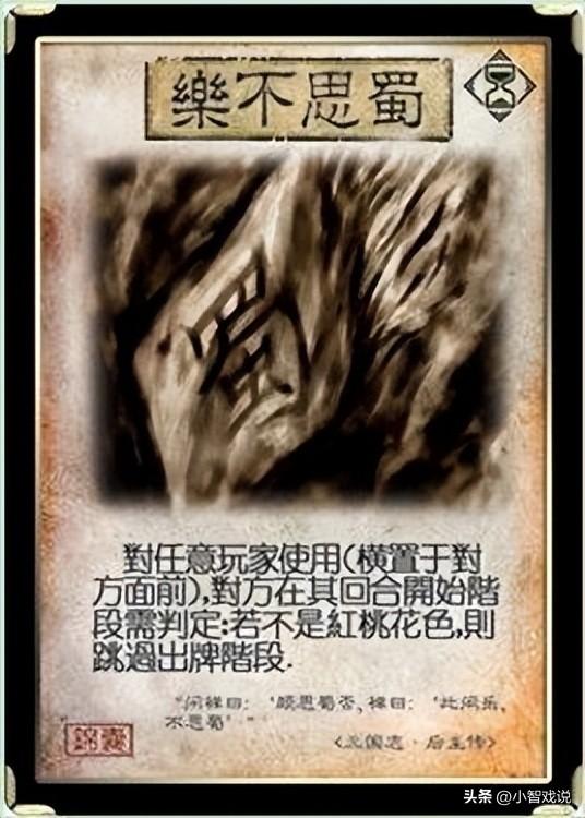 乐不思蜀算是锦囊牌中比较令人难受的牌了,甚至比兵粮寸断感受超过好几个阶级。毕竟一旦没有天过,那么乐不思蜀基本上就带有一定的兵粮寸断效果。毕竟你摸多少牌都是要弃置至手牌值的,而回合内越有爆发力的武将损失的越多。