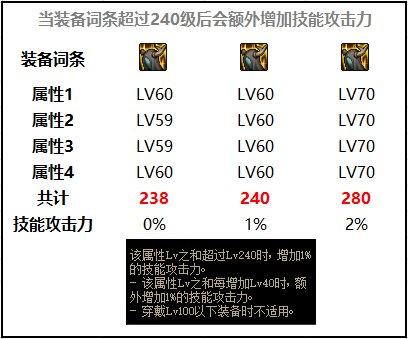 105级的史诗都有一个特性,就是当词条等级之和超过240级之后,会额外提供技能攻击力。