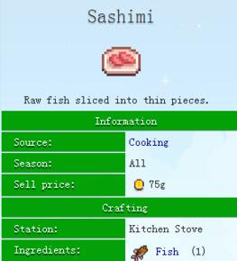 星露谷物语stardew valley生鱼片怎么做现在了解了吧,生鱼片菜谱就为你介绍到这里!这个丰富不造有没有吓到小伙伴们哦!