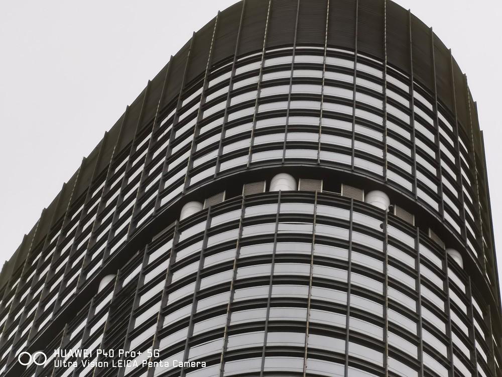 20倍变焦,P40 Pro离自己长焦镜头的固定焦段太远了,画质损耗非常大,有很多涂抹的痕迹,但因为光圈更大,画面整体更亮。P40 Pro+离自己超长焦镜头的固定焦段相对更近,画面相对没有那么模糊,我们还可以看清高楼的轮廓。