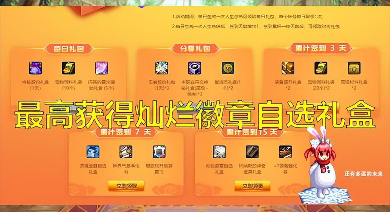 每日生成一次人生总结后,签到天数增加1,签到累积3、7、15的天数后,可领取对应礼包。