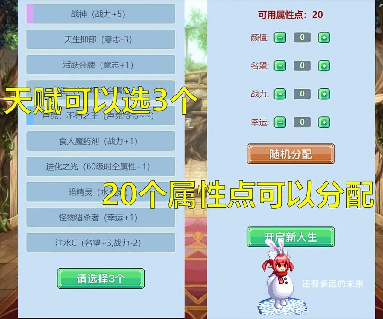 开始后可以选择3个天赋,还有20个属性点可以自由分配,每个属性最高10点。