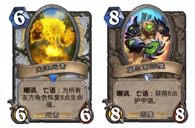 8、9费是我们的发力点,先来研究一下两个高费随从:光沐元素和莫尔葛熔魔,这套卡组也正是围绕这两张卡打的,光沐元素提供回血,莫尔葛熔魔提供护甲。一旦打出就能让牧师变得非常肉,这也正是快攻最头疼的地方,快攻不怕你场面大,就怕打不下你的血量。