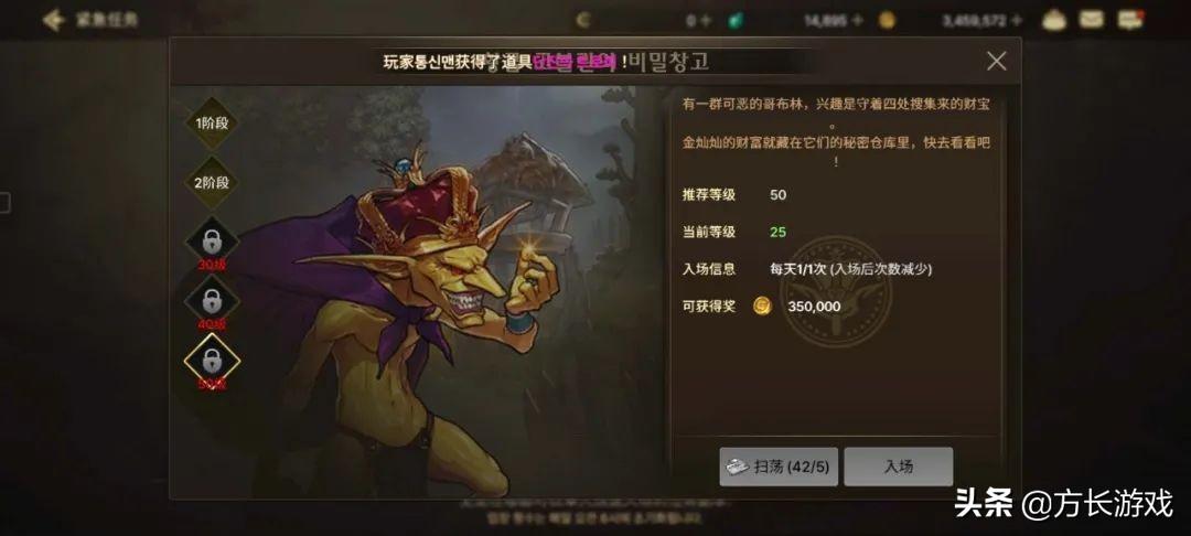 有个紧急任务玩法,哥林布金币仓库的副本,每开启一个阶段就可以获得一定的金币奖励,每天可以做一次,分别是10W、13W、17W、25W、35W。