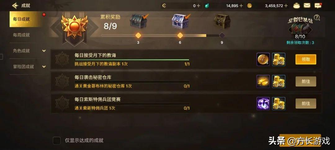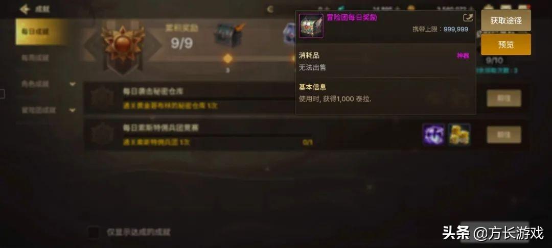 每日成就:每天完成10点成就就可以领取到一个宝箱,可以开出1000泰拉。