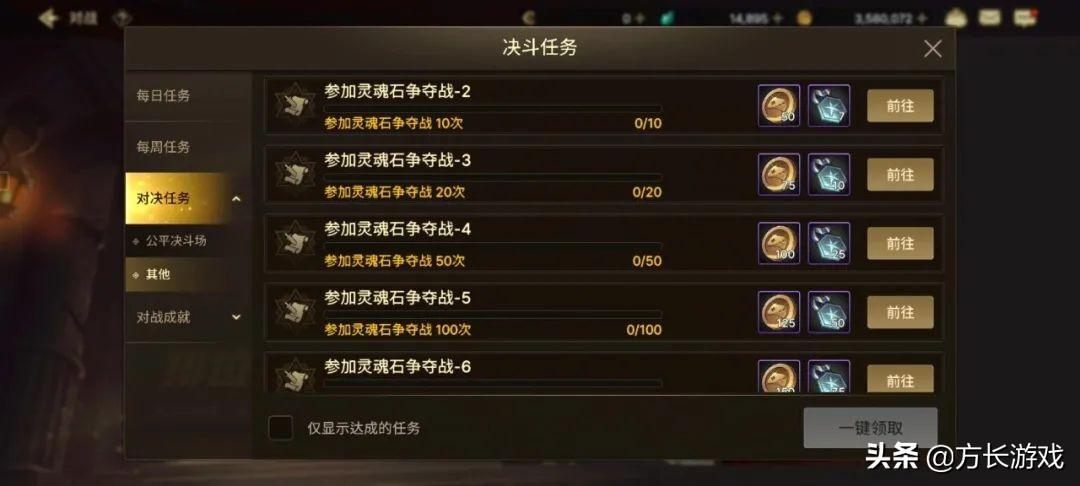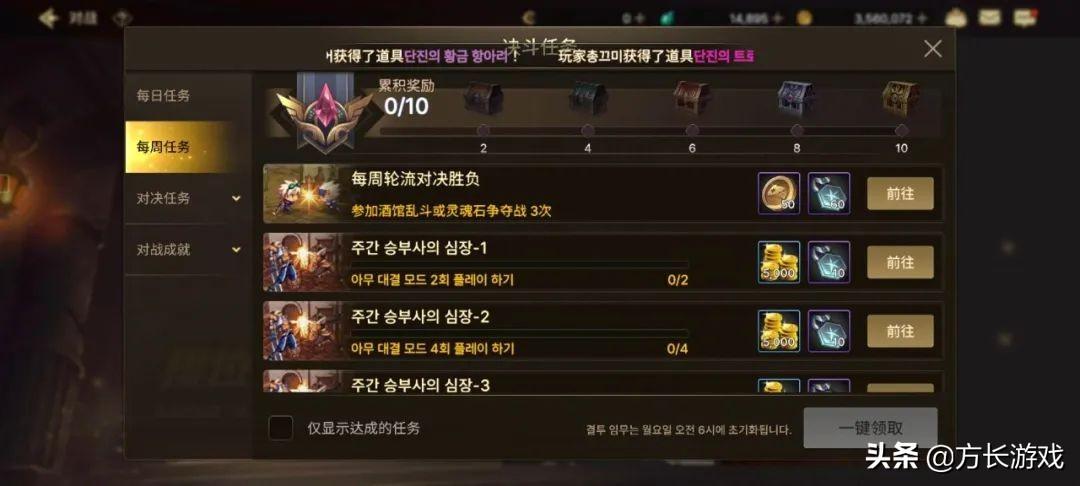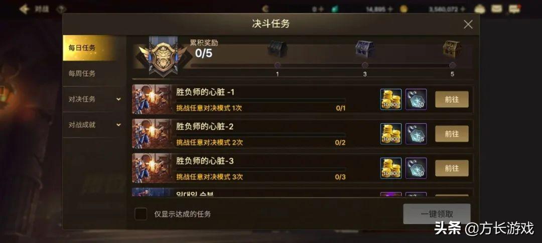 决斗场这边完成一些每日任务、每周任务就可以领取到大量的金币奖励了。