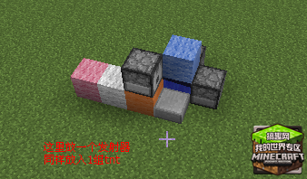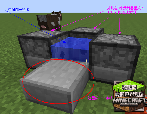 按照图中方式摆放发射器,在前边摆上半砖,在中间倒上水,用方块封顶