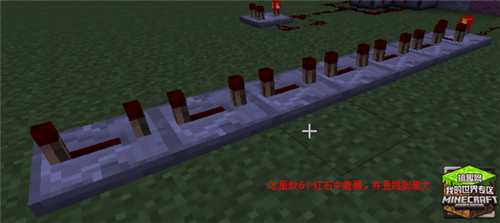 铺好红石后,将6个右键点亮红石比较器,红石中继器开到最大。