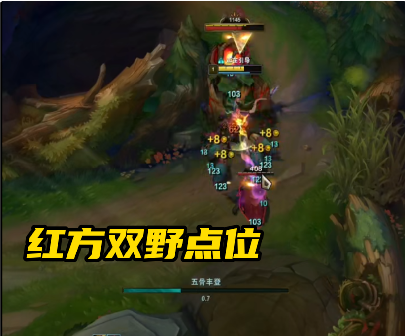 首先来说说蓝色方的拉双野操作与点位。蓝色方红buff、F6一起打非常好拉,在红buff墙边隔墙W红buff后,向上拉扯A一下六鸟即可,随后在红buff墙的转角处站定放W即可,有E技能也可以使用E技能拉红buff。